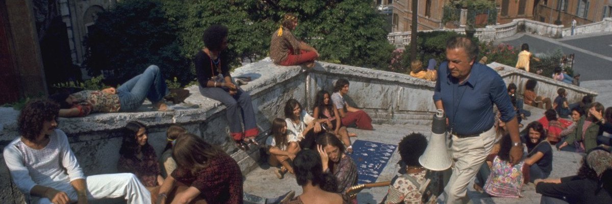 Roma è dentro la luce del maestro Giuseppe Rotunno. È la Capitale, la centrale del potere da occupare, profanare, liberare: gli hippie prendono il sole tra gli archi di Santa Maria Maggiore, suonano sulle scalinate di Piazza di Spagna, vengono picchiati dalla polizia a Trastevere mentre i borghesi approvano. Roma è il traffico infernale che assedia il Colosseo, i cadaveri sull’autostrada mentre divampano le fiamme. Il fascismo come baracconata, sbruffoneria, perversione. La burocrazia, i lavori della metro già all’epoca da cent’anni operativi.